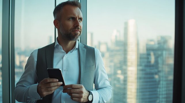 In a modern office a businessman uses his smartphone to explore digital marketing and global finance showcasing technologys crucial role in todays business world.