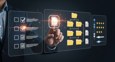 Businessman touching digital interface screen, managing documents online, organizing files and folders, and improving workflow