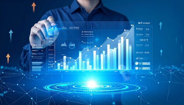 A businessman stands in an urban environment analyzing financial data on a tablet. Digital graphs and charts display trends and insights, symbolizing modern business analytics. Scalp
