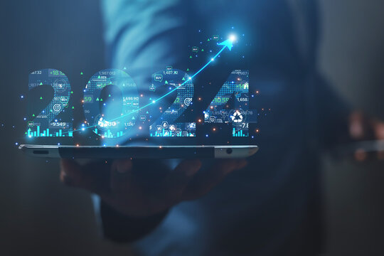 Businessman using graphic technology to analyze corporate income through laptop of annual overview, business appraisal concept in 2024