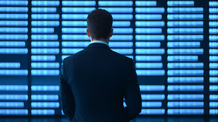 A professional in a suit interacts with a futuristic tablet, analyzing holographic charts and graphs in a high-tech environment.