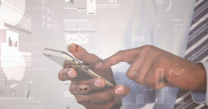 Image of statistics and data processing over businessman using smartphone