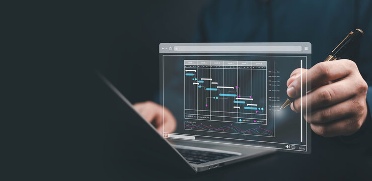 Businessman analyzing digital Gantt chart on laptop, representing project management, planning, scheduling, data analysis, productivity, and business strategy with modern technology and workflow