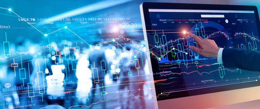 A businessman touching stock market chart to check and analyzing market data stock ,market exchange, graph growth on interface virtual screen and business group on background