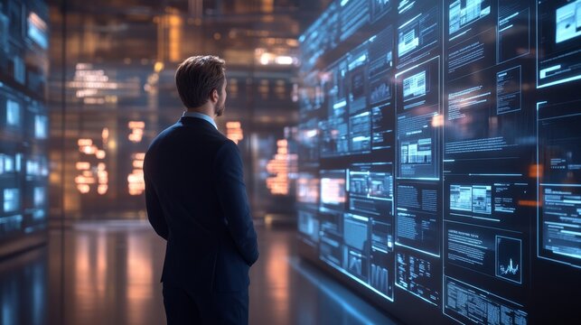 Businessman analyzing stock market data on digital display