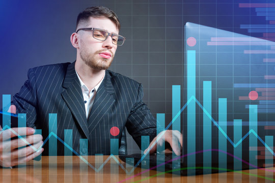 Young scientist on the background of graphs. Dynamics of economic indicators. Statistics. Exchange trade. Mathematical analysis. A man at a laptop against the background of stock information.