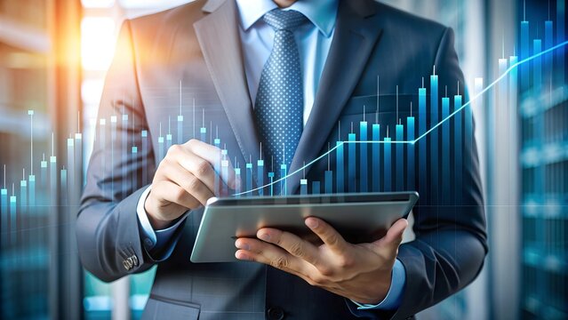 Strategic Financial Analysis: Focused businessman analyzes data on a digital tablet, with stock market charts overlaid, reflecting the fast-paced world of finance and investment.