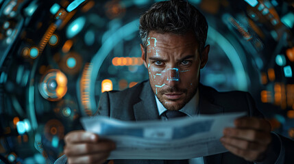 Executive Analyzing Data Digital News Interface, Corporate Tech Scene.