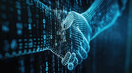Close-up of a digital handshake icon on a screen, symbolizing business network connections and teamwork collaboration in the digital age