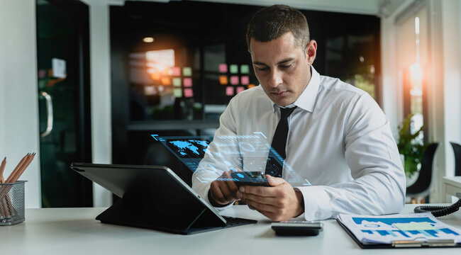 businessman investment consultant analyzing company financial report balance sheet statement working with digital graphs. Concept picture for stock market, office, tax,and project. 3D illustration.