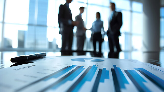 Documentary-style stock photo of financial data analysis, featuring graphs and statistics, office setting, and business people