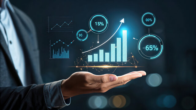 Businessman analyzing financial data with a digital interface showing cost reduction and profit increase with percentage indicators