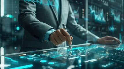 Businessman using digital interface for cost focusing and financial growth strategy in modern office.