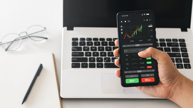 Businessman using smartphone for stock market finance chart, future IPO database or economy. Forex investment dashboard, trading online data analysis. Broker buy or sell cryptocurrency by SET index.