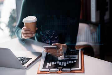 Businessman using a smartphone with computer keyboard at office on digital interface. innovation, icon and media information on network connection.