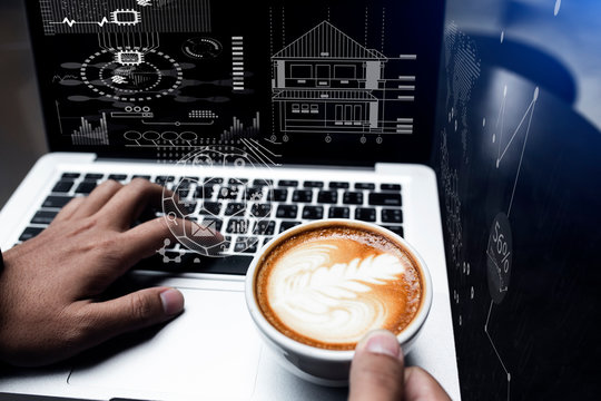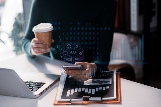 Businessman Analyzing Global Data While Drinking Coffee At Office Desk Images
