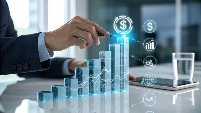 Businessman analyzing economic growth chart on virtual screen for business finance and financial decision making, strategy, data collection, forecasting, financial concept and business investment.