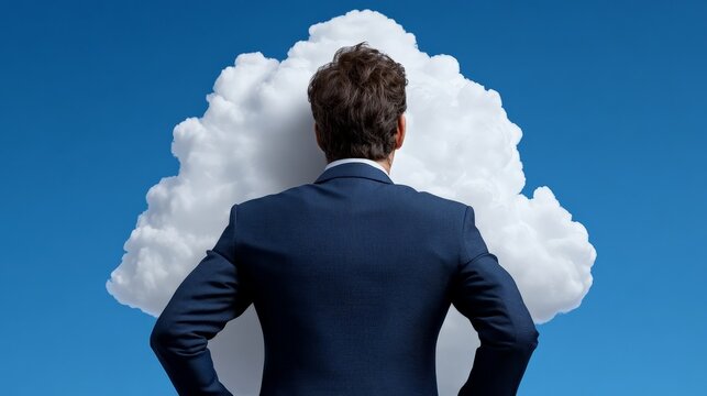 Cloud Computing Concept: A businessman stands with his back to the viewer, facing a large stylized cloud against a clear blue sky, symbolizing the vast potential and possibilities of cloud computing.