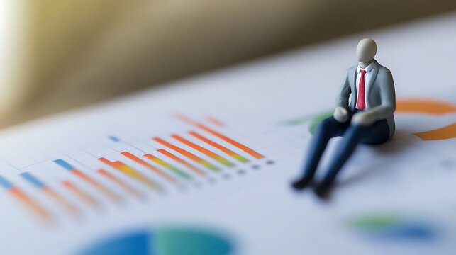A miniature figure in business attire sits thoughtfully atop a financial report, contemplating market trends and data analysis. A symbol of strategic decision-making and oversight.
