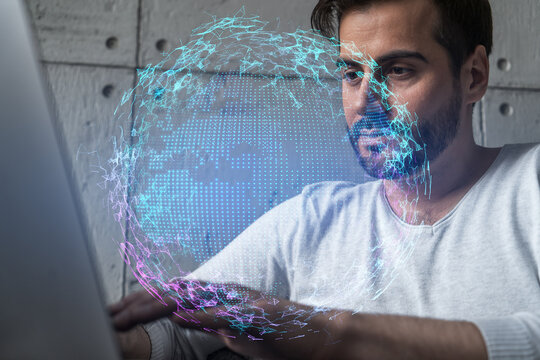 A serious caucasian manager in casual wears, using laptop to develop a new worldwide supply chain. Double exposure. globe and map hologram.