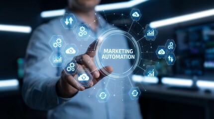 Businessman engaging with advanced marketing automation technology in a modern office setting. productivity in a professional environment.