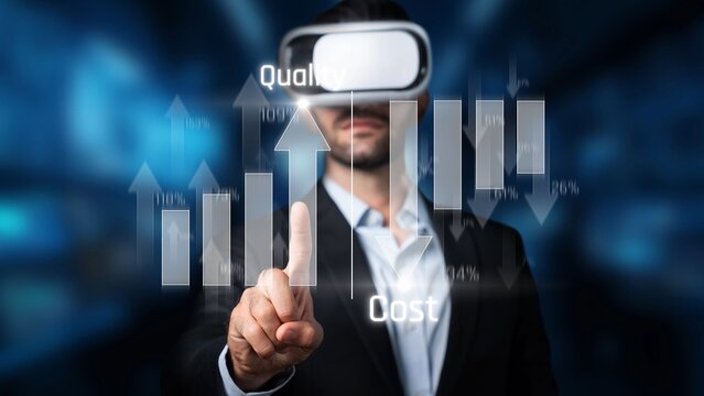 A businessman engaged in virtual reality, exploring data metrics for quality and cost management. The image showcases innovative technology and professional analysis. Raster