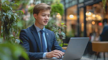 Businessman using laptop computer, engaged in digital tasks with virtual documents appearing on screen, showcasing modern technology and productivity