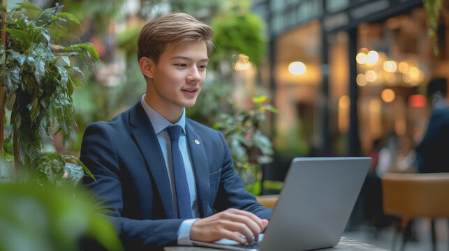 Young Businessman Multitasking Effectively While Engaged in Video Calls and Analyzing Data in a Lively Outdoor Setting