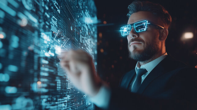 Innovator in Augmented Reality: A sharp business person engages with an interactive interface, wearing futuristic glasses and immersed in digital data within a high-tech environment.