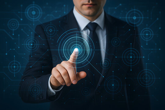Digital Interface: A modern business executive with sharp attire, engaging with a sophisticated digital interface, seamlessly navigates technological progress.