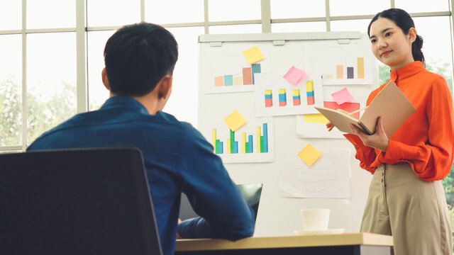 Young woman explains business data on white board in casual office room . The confident Asian businesswoman reports information progress of a business project to partner to determine market strategy .