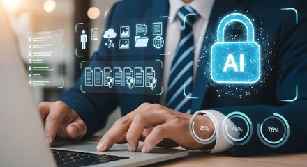 AI Innovation: A focused businessman interacts with a holographic AI interface, exploring data analytics, security, and neural networks.