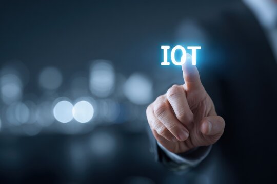 Businessman works with digital technology and explores Internet of Things concepts at night in a modern urban setting