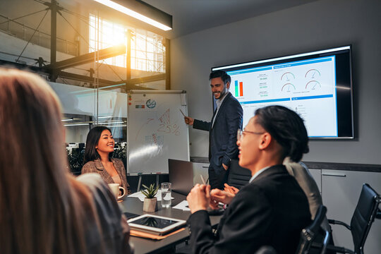 Asian businessman presenting data on flip chart during business meeting, illustrating analysis, strategy, and corporate planning. Great for concepts like leadership, teamwork and performance review.