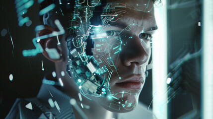 A professional businessman engages with a virtual reality headset, merging law and technology through digital interface icons, representing modern solutions in the industry. Raster