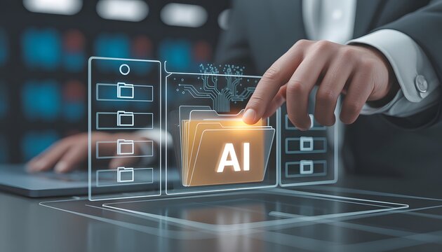 Businessman Interacting with AI Data Management Interface in Modern Office