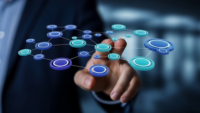 Businessman interacting with digital data synchronization interface concept on futuristic blue background with technology and cloud computing icons.