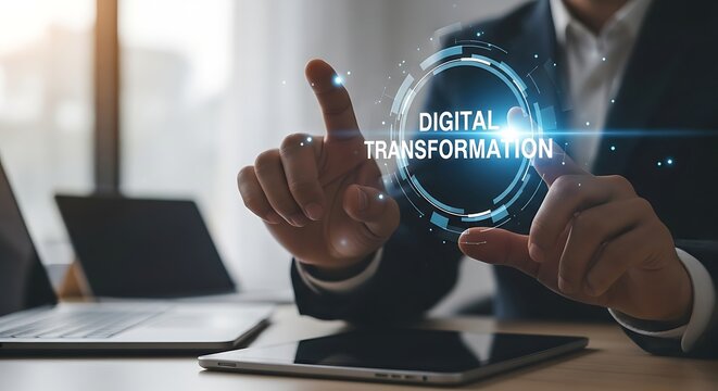 Businessman interacting with a glowing ai interface hologram in a futuristic digital world