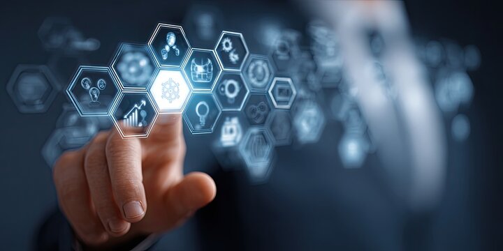Businessman interacting with digital gears and icons representing technology and innovation
