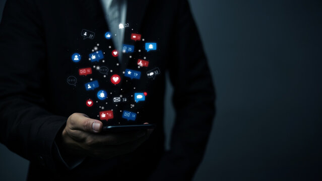 businessman holding a smartphone with floating social media icons, digital marketing commerce, online engagement, and social networking. mobile phone with notification engagement strategies.