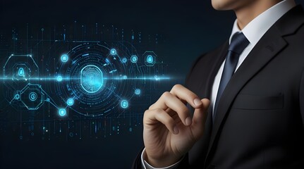 Businessman interacting with digital security interface showing padlock and data analytics