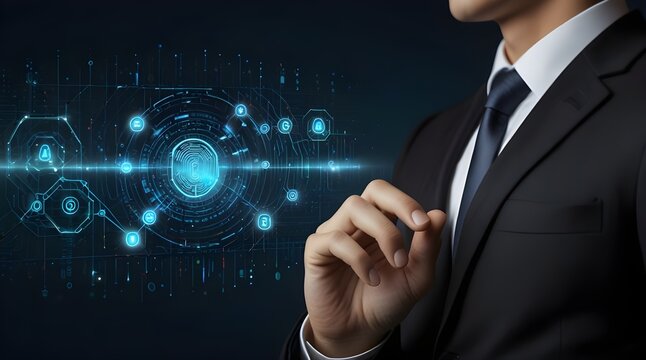 Cyberspace ​​security internet protection personal information. businessman Unlock with fingerprint scanner password secret code for safety data on internet cloud virtual interface lock. generative.ai