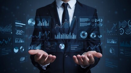 Businessman holds data-driven tech insights. Modern digital graphs, numbers float in hands. Informed business strategies, data management. Tech, analytics concepts. Decision making process presented