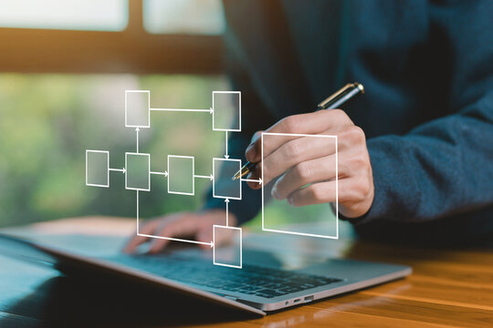 businessman using computer design workflow automation with flowcharts. diagram algorithm flow, model work structure digital, hierarchy scheme. business process and data management organigram