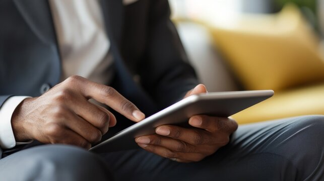 Digital workflow with tablet and stylus in professional setting. Tech-savvy person using tablet with floating document icons. Modern office productivity with blue checkmark.