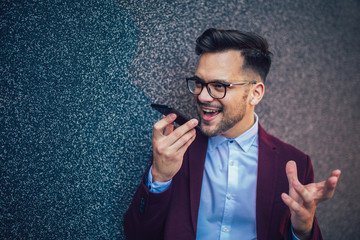 Business, people, tehnology and lifestyle concept: Businessman use smartphone to send voice messages outdoors at downtown.