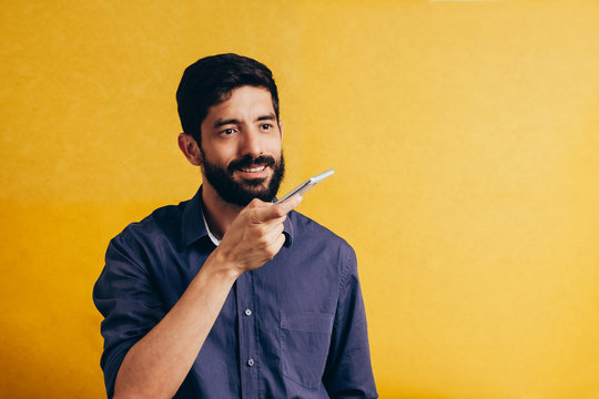 Businessman Smiling While Using Smartphone Voice Command Technology Images