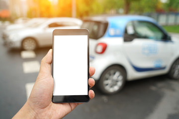 Closeup of male hand holding and using modern smart phone with blank screen for your text or content, with night light bokeh