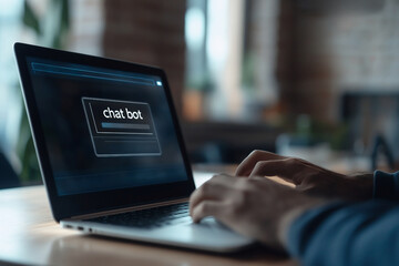 A laptop with a chat bot window open with the words chatbot in a home office or professional setting