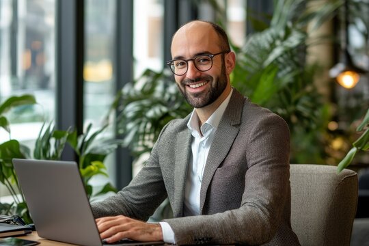 Smiling professional man wearing glasses concentrating on his work at a desk, reviewing documents while using a laptop and calculator in a contemporary office setting